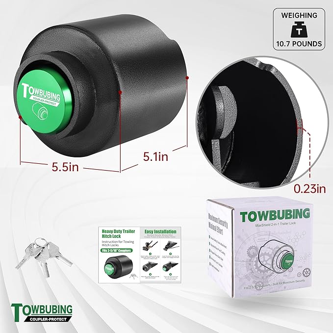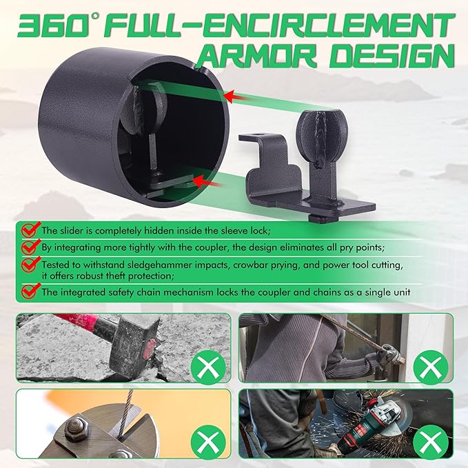 - 【Ultimate 360° Security for 2-5/16" Couplers】The 360° full-encirclement armor design eliminates pry points. The integrated safety chain mechanism locks the coupler and chains as one unit, preventing thieves from hitching or towing the trailer. Tested to withstand sledgehammer impacts, crowbar prying, and power tool cutting,offering robust theft protection;