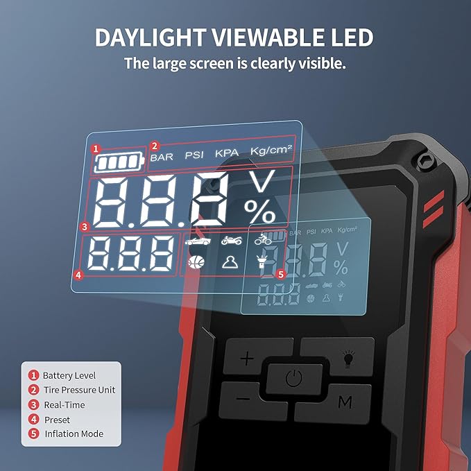 - Portable Jump Starter with Air Compressor & Tire Inflator:Features 4 inflation modes (Cars, Motorcycles, Bicycles, Basketballs) and 4 different nozzles, catering to multiple inflation needs. This jumper box for car battery portable has a 150 PSI max pressure and 26L/Min airflow,Max35L/min,inflating a 195/65R15 tire from 6 PSI to 36 PSI in just 5 minute. Smart preset & auto shut-off without repeated adjustment and check.Large LCD display to read real-time data.Supports 4 unit measurements (BAR/PSI/KPA/kg/cm²) for convenience