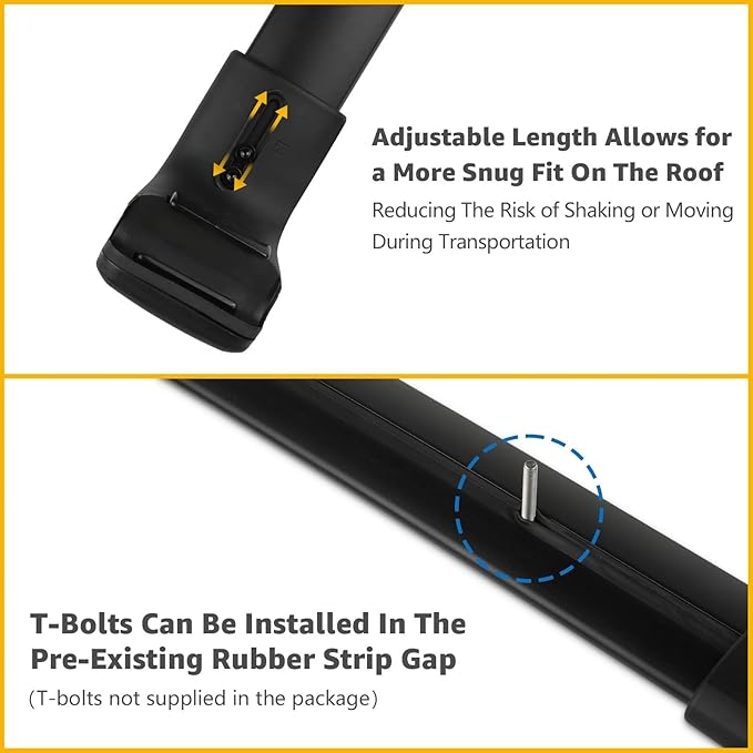- EXCLUSIVE UPGRADES: With the rubber strip design in the middle of the crossbar, you can use a knife to cut through the slit reserved at one end to the middle, and subsequently fit in the T-bolts, making it easy for you to mount roof boxes, bike racks, kayaks, and other accessories on the crossbar.
