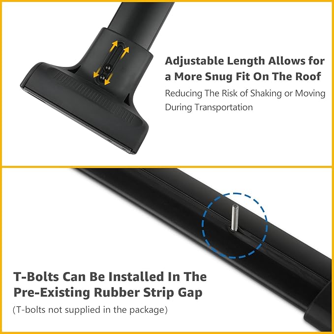 - EXCLUSIVE UPGRADES: With the rubber strip design in the middle of the crossbar, you can use a knife to cut through the slit reserved at one end to the middle, and subsequently fit in the T-bolts, making it easy for you to mount roof boxes, bike racks, kayaks, and other accessories on the crossbar.
