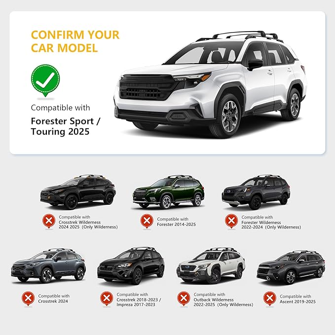 - COMPATIBILITY: This Roof Rack Cross Bar is Compatible with Subaru Forester Sport/Touring 2025 2026, Please check the Make, Model and Year of your vehicle before purchasing ! This crossbar is designed specifically for your vehicle, and the specialized style will fit more securely than the universal ones. Anti-theft locking system for security in the outdoors.