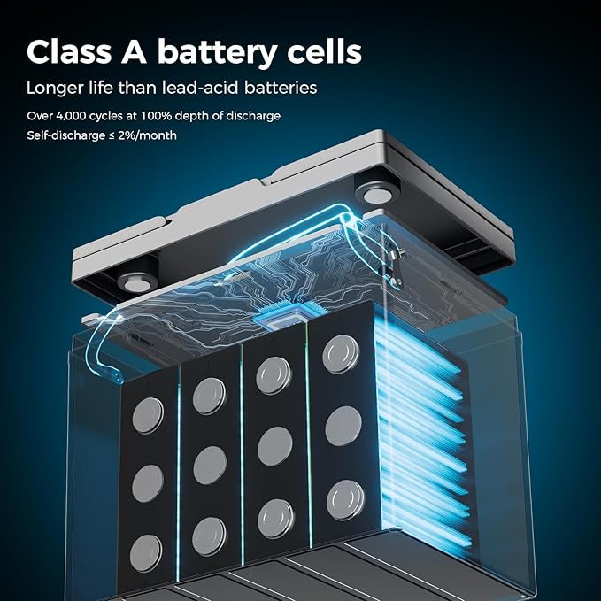 - 【Premium A+ Grade Cells & 6000+ Deep Cycles】Dyness LiFePO4 Battery engineered with top-tier A-Grade LiFePO4 cells, which delivers exceptional longevity, higher power density, and inherent safety. Enjoy peace of mind with: ①10-Year Lifespan: Lasts up to 6X longer than standard lead-acid batteries.②Superior Energy Density: Packs 3-5X more power in the same space vs. traditional batteries.③Rigorous Safety Assurance: Independently tested and certified to global standards including FCC, CE, RoHS, and UN38.3 for reliable operation. Each A+ grade battery cell is tested by a professional engineering team, so you can trace the production parameters of each cell
