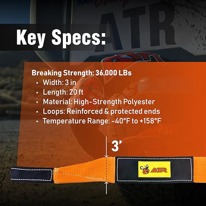 ATR Recovery Tow Strap 3β³ x 20 ft β 22,200 lbs Breaking Strength, Heavy Duty Off-Road Recovery Strap for Truck, Jeep, SUV, Snatch Strap with Storage Bag β ATR USA