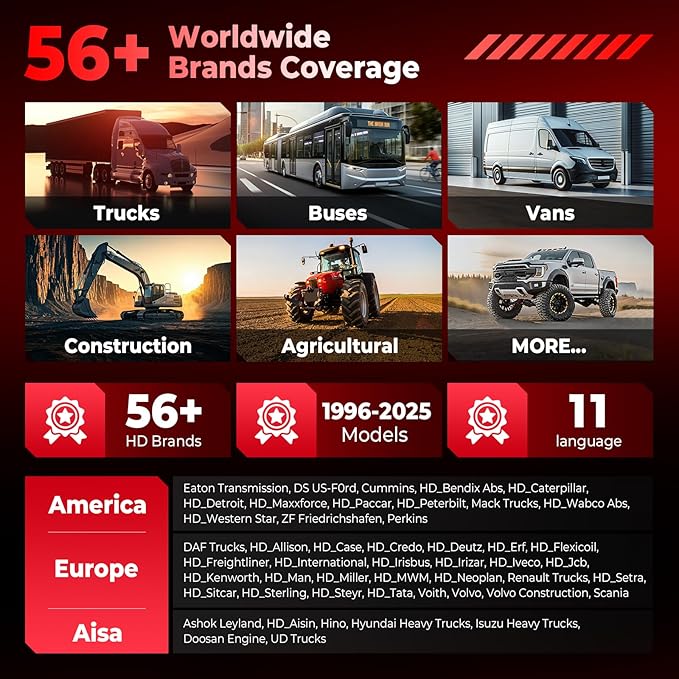 - 【Wide Vehicle Range of Compatibility】Supports OBD2/CAN, J1939, J1587, and J1708 protocols for Class 3–8 trucks (33,000+ lbs), heavy-duty vehicles, buses, vans, construction/agricultural equipment (1996–2024 models); compatible with 56+ global brands including Cummins, Detroit, Caterpillar, Volvo, Freightliner, Paccar, Peterbilt, MAN, Scania, DAF, Isuzu, Hino, and John Deere, covering 10,000+ commercial models. Ideal for diesel trucks, semi-trucks, pickups, and machinery across brands like Aisin, Allison, Mercedes-Benz, Ford Diesel, and Case; no regional restrictions for worldwide use.