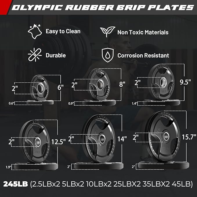 - 【245LB Barbell Set】The set includes a 6-foot barbell with a pair of collars and a set of 245lb weight plates: 2x2.5lb, 2x5lb, 2x10lb, 2x25lb, 2x35lb, 2x45lb. With the barbell included, the total weight adds up to 275lb. These cost-effective equipment are perfect for long-term training use.