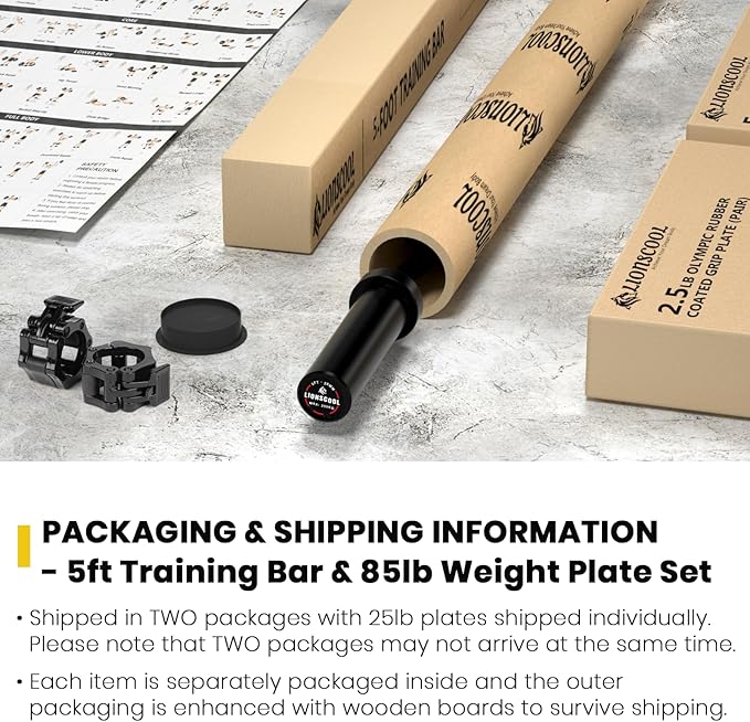 - All In One Kit to Meet Your Needs: We’re dedicated to providing convenient and effective workout solutions for all. Get this 4.9ft training bar and weight plate set. It is perfect for daily strength training and bodybuilding exercises that can be performed without the need of a power cage. Shipped in TWO packages, this set includes a 4.9ft training barbell and pairs of 2.5lb, 5lb,10lb and 25lb 2-inch rubber coated Olympic weight plates, all the plates totaling 85 pounds. Please notice the pair of 25lb plates is shipped separately. Barbell clamps are included.
