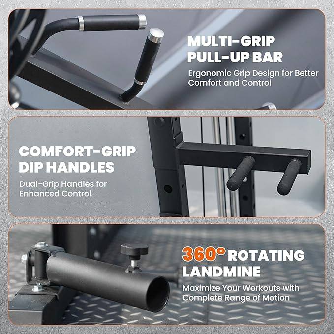 - Complete Strength Package: Includes 16 professional attachments: Multi-grip, 2 Sandwich j-cup, dip bars, safety bar, 2 handles, lat pulldown pedal, 360° landmine, 2 Olympic barbell holders, 4-post plate storage, dual cable bars, landmine pivot, lat bar, cable bar, T bar, 6 band pegs, clip.