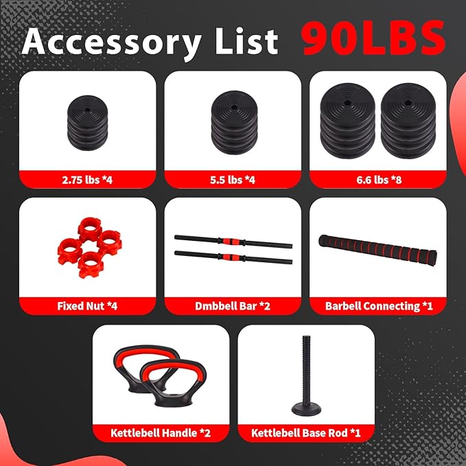 Adjustable Dumbbells Set - 20lbs/30lbs/70lbs/90lbs Multi-Functional Fitness Set, Kettlebell & Barbell Patterns, Beginner Dumbbell Fitness