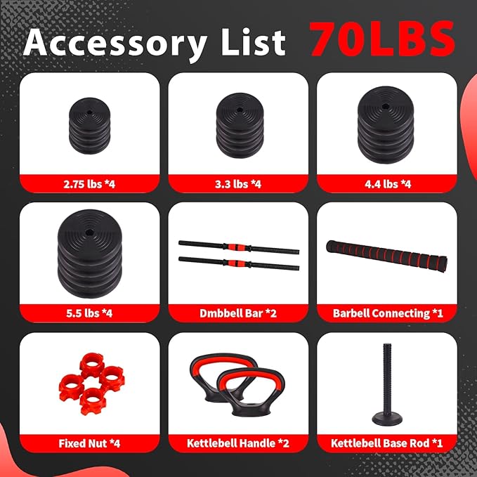 Adjustable Dumbbells Set - 20lbs/30lbs/70lbs/90lbs Multi-Functional Fitness Set, Kettlebell & Barbell Patterns, Beginner Dumbbell Fitness
