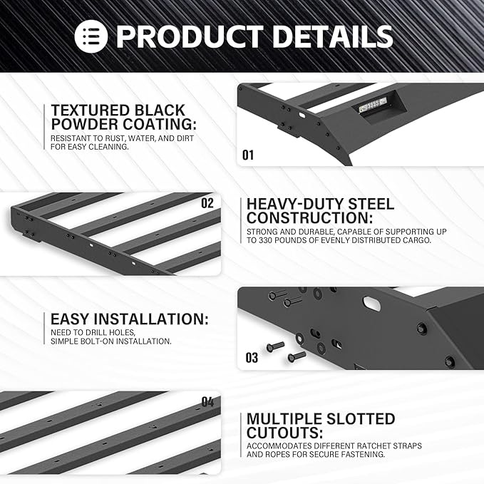 - 【High Load Capacity】: Supports up to 330 lbs, providing extra storage for camping gear, off-road equipment, bikes, travel essentials, and more.