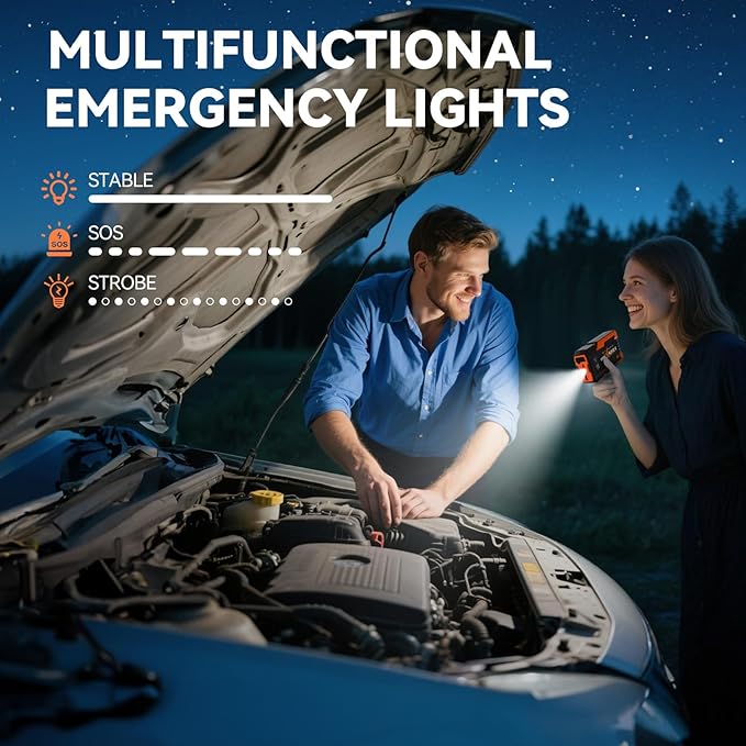 - 【BACKUP PORTABLE CAR BATTERY PACK】You can also use this portable jump starter battery pack as a 51.8Wh battery capacity portable power bank to charge your smartphones, tablets, or other USB electric devices. This battery booster jump starter pack equipped with USB OUTPUT (5V/2A) and Type-C INPUT (5V/2A 9V/2A), 50% faster than a standard charger. It also comes with a super bright LED light, which is used as an emergency flashlight with strobe and SOS signal, is great for camping, outdoors, indoors, emergencies, travel, etc.