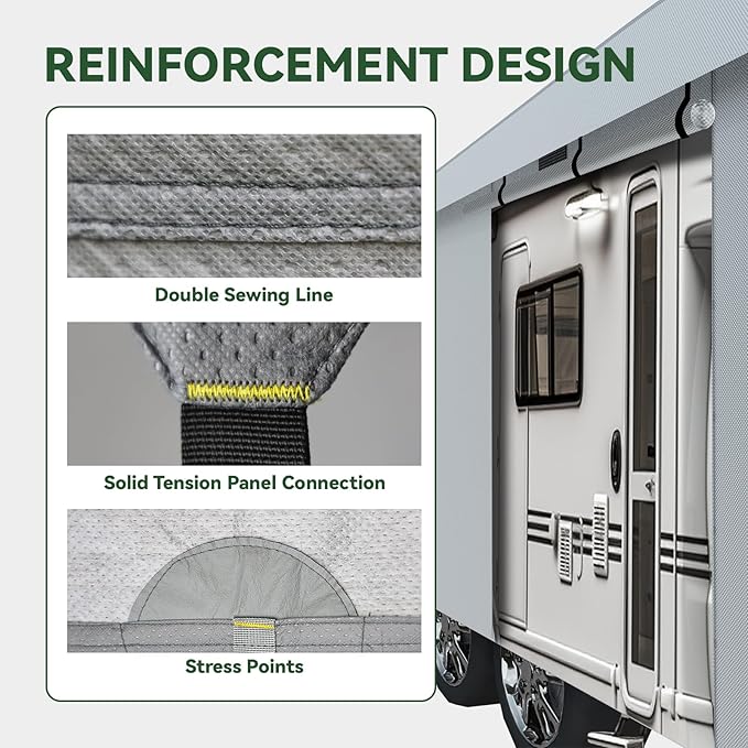 - WIND PROTECTION: Designed with reinforced straps, and high-quality, wind-resistant materials to ensure a secure and tight fit. These features help protect your RV from strong gusts and prevent the cover from lifting or tearing, giving you peace of mind even during stormy conditions.
