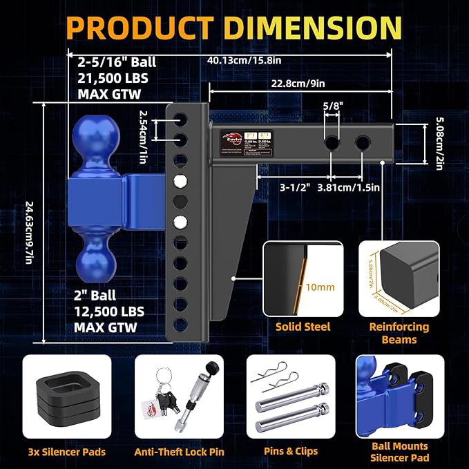 - 【FITS 2” RECEIVER ONLY & HIGH TOWING CAPACITY】- Euvlvt Adjustable Trailer Hitch Fits 2-Inch Receiver and Features a Dual Ball Design, the 2" Hitch Ball GTW Towing Capacity of 12,500 lbs + Reversible 2-5/16" Ball with a 21,500 lb GTW Towing Capacity for Hauling Boats, Heavy Trucks, RV, Trailer, Camper & More! Meeting All the Needs of the Adjustable Trailer Hitch in Daily Life and Work.