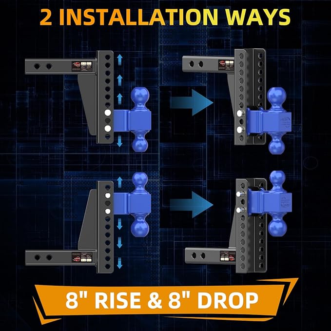 - 【8" ADJUSTABLE & VERSATILE APPLICATION:】- This Adjustable Drop Hitch Offers 11 Height Adjustable Holes with a 8 Inch Drop/8 Inch Rise. And Its Ability to Drop or Rise in 1” Increments Provides the Perfect Fit for Trailers of Different Heights, Without Having to Worry About It Not Sitting Level. Best Ideal for Class III and IV Vehicles Trailer Hitch Recievers. This Drop Hitch is Compatible with Dodge Ram 1500, Jeep Wrangler / Cherokee, Chervrolet Silverado / GMC Sierra 1500, Ford F-150 / Ranger, Toyota 4 Runner / Tundra / Tacoma, Nissan Titan & More.