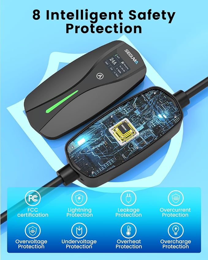 - 【Built for Safety — NACS Level 2 Charger by SEGUMA】Engineered for durability, the SEGUMA tesla charger level 2 is IP66 weather-resistant, UL 94V-0 flame-retardant, and built to operate in extreme temperatures from -22°F to 122°F. It offers comprehensive protection against lightning, leakage, undervoltage, overvoltage, overheating, overcharging, and overcurrent
