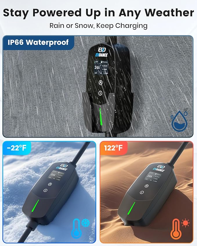 - Nonstop Safety & Weatherproof Charging with UltraGuard Charger: Equipped with 6-advanced safeguards — lightning deflection, leakage blocking, smart current/voltage control, thermal shutdown, and anti-overcharge tech — EVDANCE 24A LEVEL 2 mobile charger defends Tesla-Compatible EVs and household wiring 24/7. Built tough with IP66-certified casing (operates in -22°F to 122°F), this Tesla-equipped home charger LEVEL 2 handles rain showers and dust storms for daily use, but do NOT operate during hurricanes, thunderstorms, or flooding — unplug immediately and store indoors. Note: Always cover connector head with included cap when stored; Plug-socket remains non-waterproof.