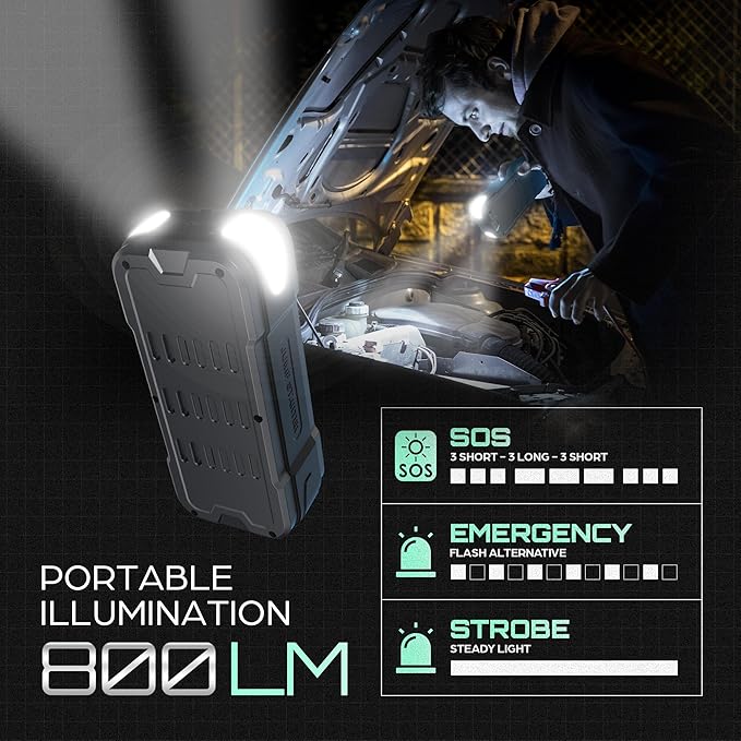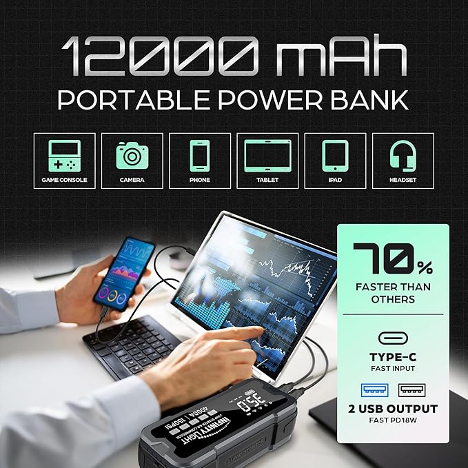 - Portable Power Bank & LED Flashlight: With a 12,000mAh capacity, USB-C fast input charging, and dual USB outputs, this device powers your electronics on the go. It also includes an 800Lm LED flashlight with SOS and strobe modes for added safety and visibility.