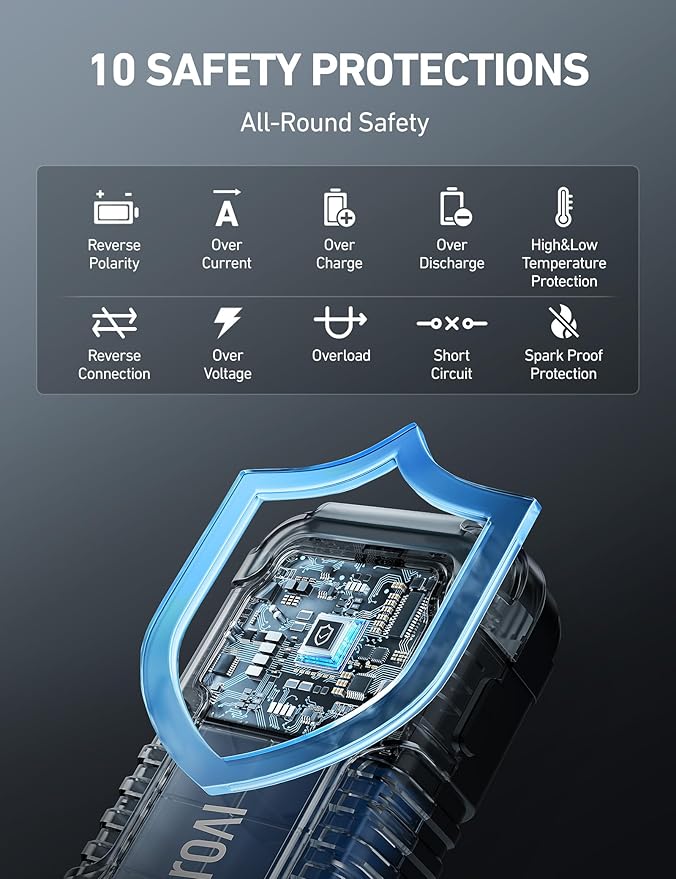 - COMPREHENSIVE PROTECTION: This jump starter is equipped with 10 comprehensive safety features, including reverse polarity, overcurrent, overcharge, overdischarge, high temperature, reverse connection, overvoltage, overload, short circuit, and spark-proof clamps.