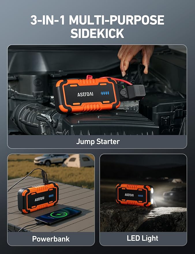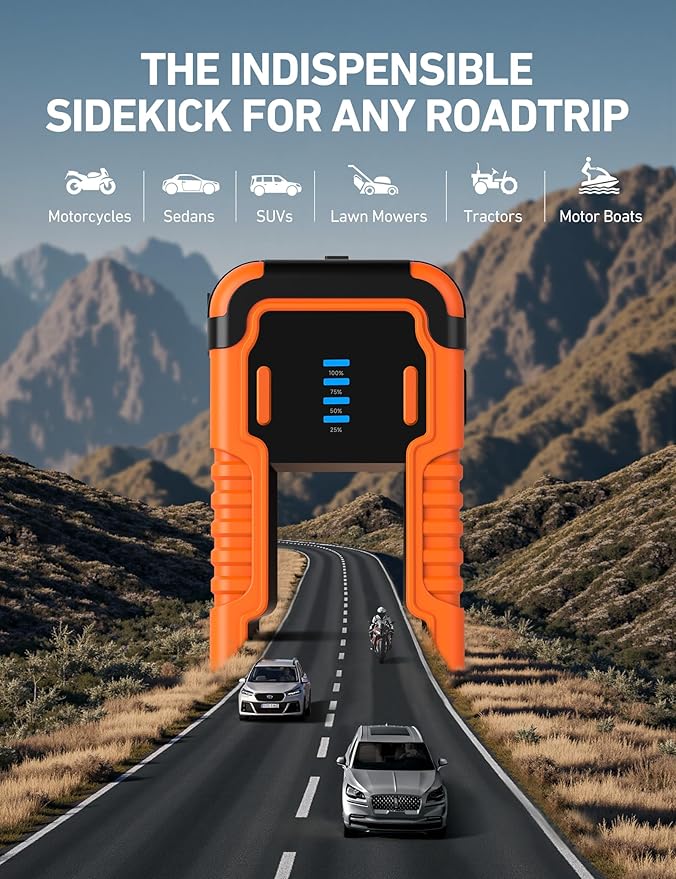 - HIGH-PERFORMANCE JUMP STARTING: With an impressive peak current of 5000A, this multifunctional jump starter can instantly revive a wide range of vehicles, including sedans, motorcycles, SUVs, lawn mowers, tractors, and motorboats, supporting engines up to 10L gas and 8L diesel. It’s built to handle all your daily and emergency jump-starting needs with ease.