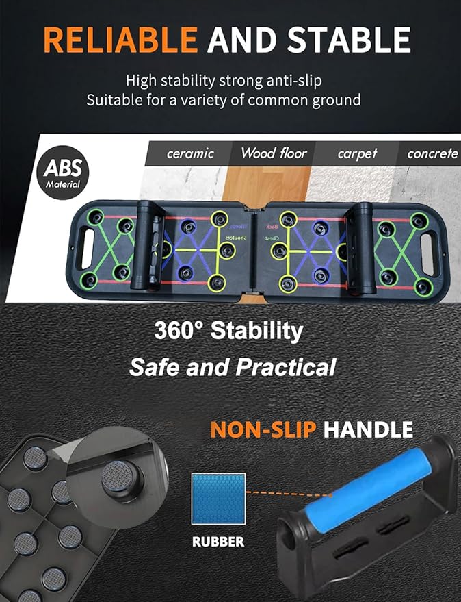 - 【Easy to install】This push-up board is very simple to use and does not take you much time, just unfold it in a flat area, Clip the two panels together, then you can complete the exercise anywhere.