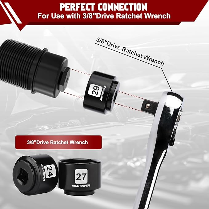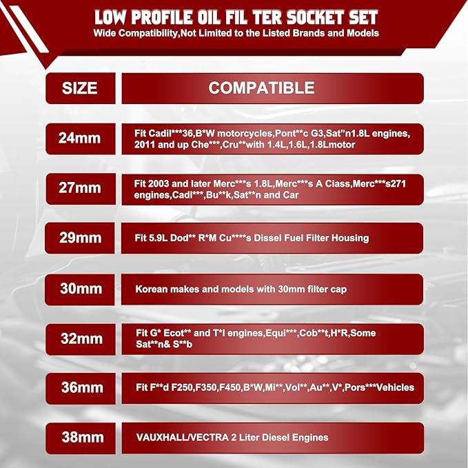 - 【Set Include】This set includes 3/8-inch Drive low profile oil filter sockets in sizes: 24mm, 27mm, 28mm, 29mm, 30mm, 32mm, 36mm, 38mm.