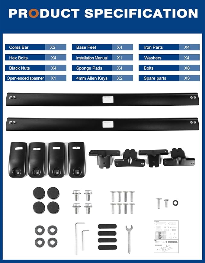 - 【Easy Installation】Absolute breeze to install and it fits like a glove. The easy direction + clear label on the product will provide great assistance to figure out how to install it. Package comes with a pair of crossbars, four end supports, Accessory Kit (Stainless screws + Allen wrench + spare parts), instructions.