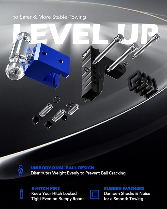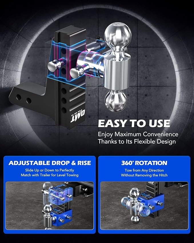 - Effortless Adjustment: Simply lock the hitch in place with the included pins and go. The dual balls rotate 360° and slide up or down 6 in. so you can perfectly match your trailer's height without any hassle