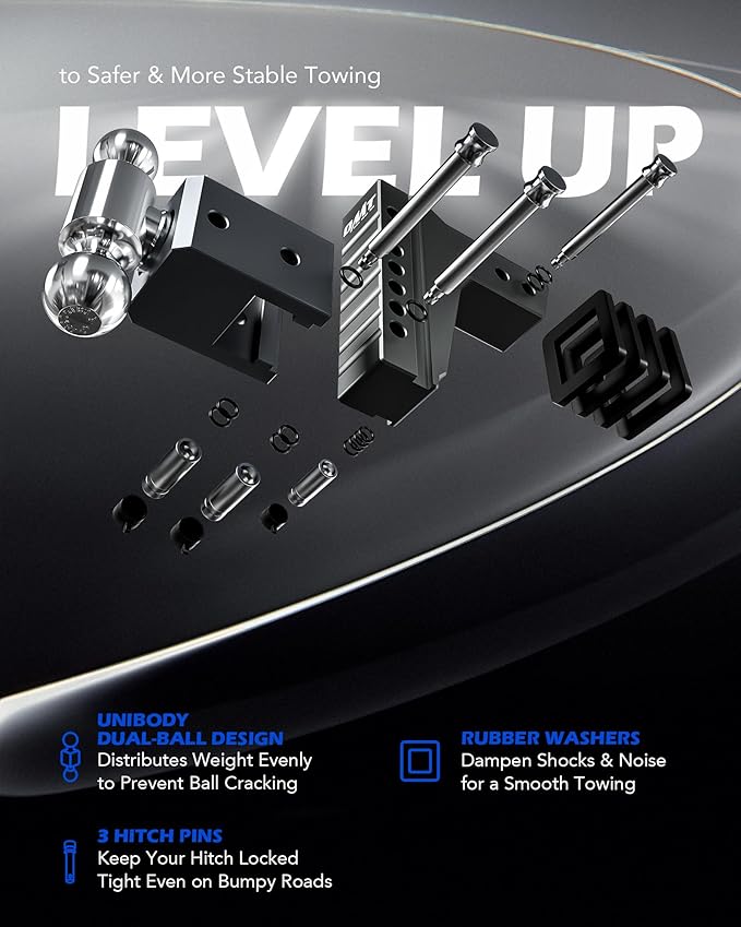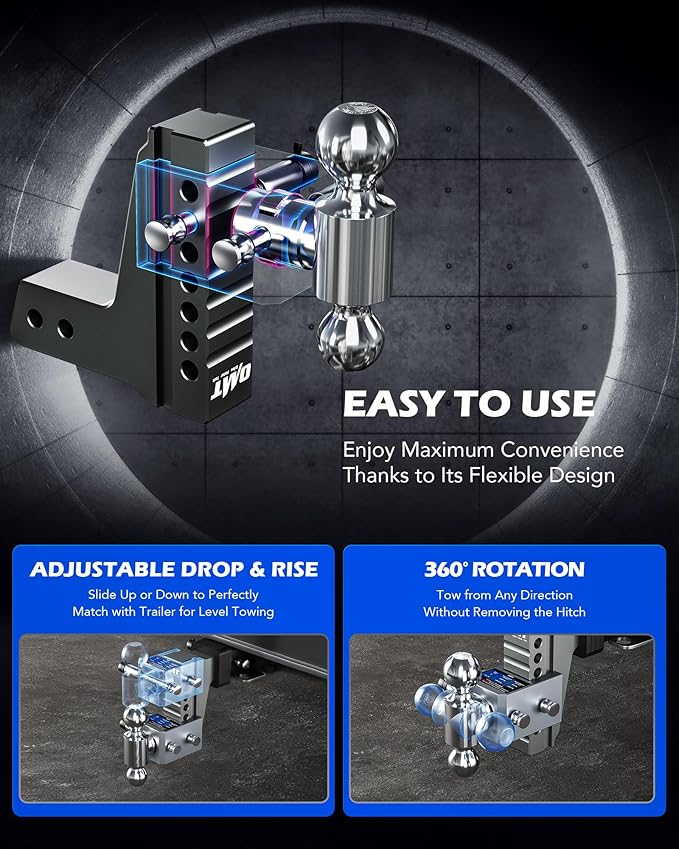 - Effortless Adjustment: Simply lock the hitch in place with the included pins and go. The dual balls rotate 360° and slide up or down 6 in. so you can perfectly match your trailer's height without any hassle