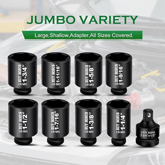 1/2" Drive Impact Socket Set, 9-Piece Standard SAE Deep Axle Nut Sockets, 6-Point, Cr-Mo,1-1/4,1-3/8,1-7/16,1-1/2,1-9/16,1-5/8,1-11/16,1-3/4, Impact Socket Adapter (3/4" x 1/2")