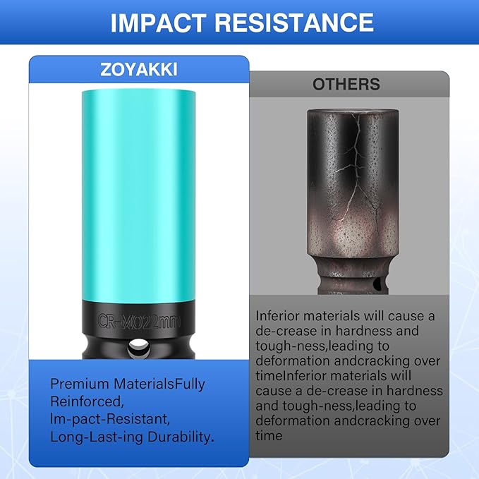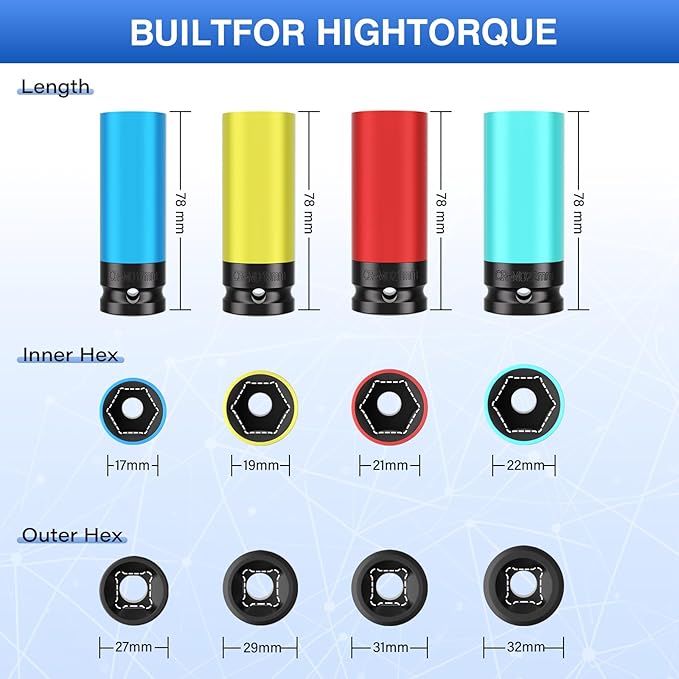 - Alloy Nut Sockets:The ZOYAKKI 4PCS 1/2" Color-Coded Protective set includes metric sockets:,17mm(blue),19mm(yellow),21mm(red),22mm(green).Widely Used in various scenarios and fields,including automotive repair and maintenance,tire services,racing and high-performance vehicles,hub assembly,and wheel and suspension system maintenance