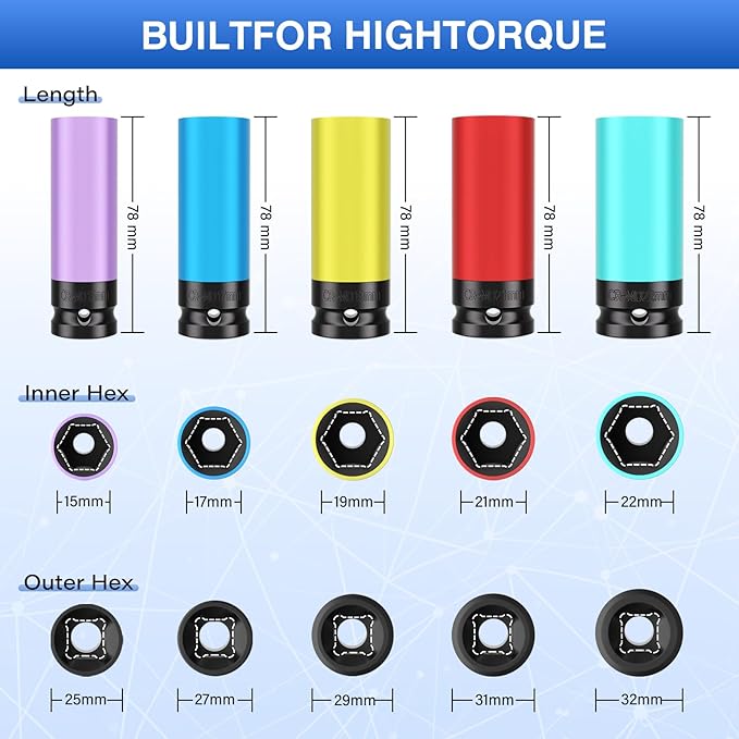 - Alloy Nut Sockets:The ZOYAKKI 5PCS 1/2" Color-Coded Protective set includes metric sockets:15mm(purple),17mm(blue),19mm(yellow),21mm(red),22mm(green).Widely Used in various scenarios and fields,including automotive repair and maintenance,tire services,racing and high-performance vehicles,hub assembly,and wheel and suspension system maintenance