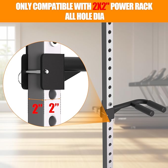 - 【COMPATIBLE WITH 2x2 INCH POWER RACK】—The compact size of our dip bars for home makes them ideally fit a 2×2 inch power cage with 5/8" or 1" holes, easily attach it to the frame without taking up too much time