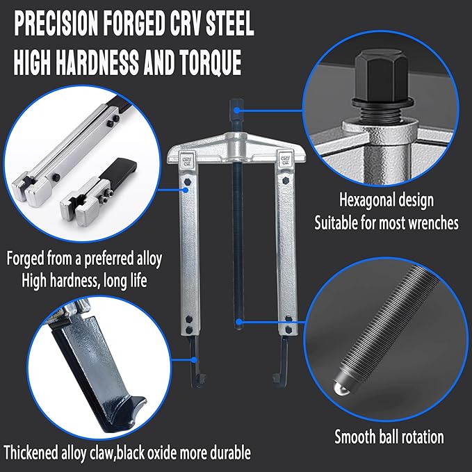 - 【High Quality Puller Set】 Our gear puller set is made of high-quality Cr-V steel precision machined, after cold forged and heat-treated has higher strength and hardness. Surface chrome-plated and blackened finish, prevents rusting, Improves corrosion resistance and durability, puller tool a longer service life.