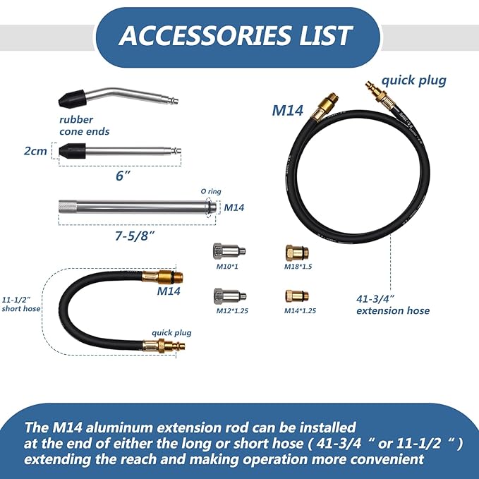 - 【Versatile and Durable Connectors 】Constructed with aluminum and rubber, the straight/angled universal push-on connectors eliminate the need for threading into spark plug wells, making them compatible with almost all petrol engines. The M14 aluminum extension rod can be installed at the end of either the long or short hose (41-3/4" or 11-1/2"), extending the reach and enhancing operational convenience. Adapter sizes include M14*1.25, M18*1.5, M10*1, and M12*1.25, with high-quality, deep threads ensuring secure fitting and durability.