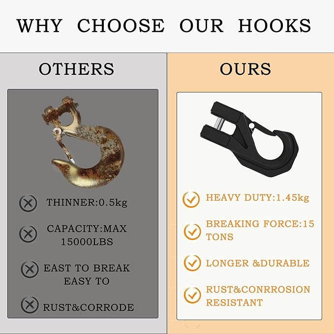 - 【Durable Material】Made from ultra-strong forged 40Cr steel, the winch hook features electroplating and spraying for double rust and corrosion protection.