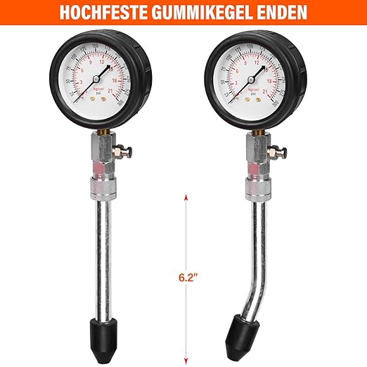 - COMPLETE SET:Package: 1 x pressure gauge, 1 x straight rubber cone adapter, 1 x curved rubber cone adapter, 4 x brass adapters and 1 x 17" extension hose, 1 x metric and imperial feeler gauge, 1 x spark plug tester