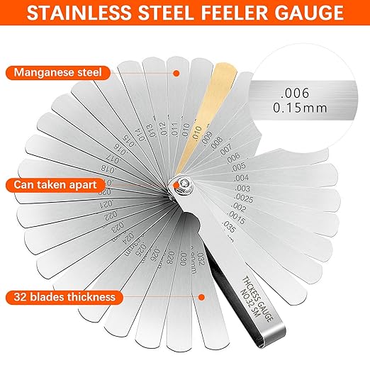 - FEELER GAUGE: High-quality stainless steel construction. Measures the thickness or width of components such as screws, valves, and bearings