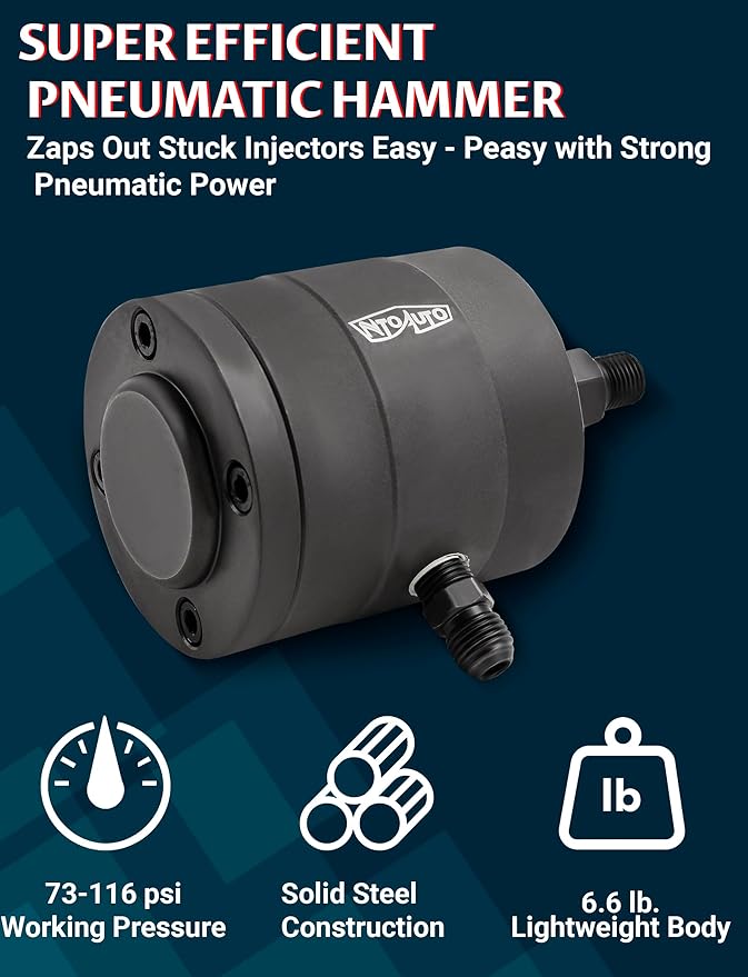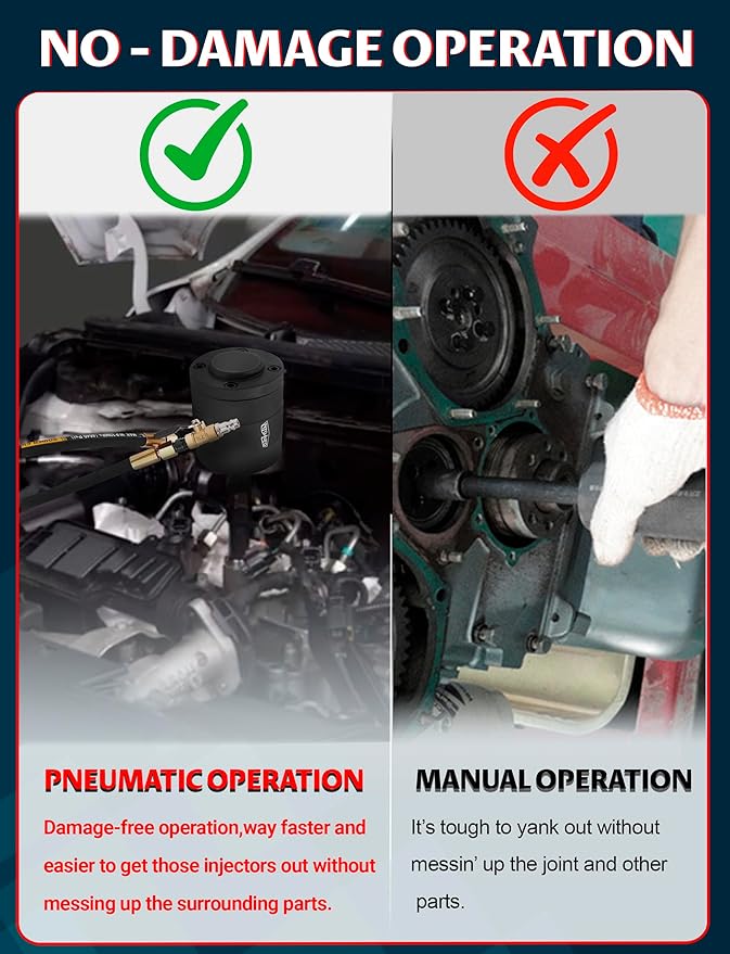 - 【Safer & Faster Than Manual Tools】 Skip risky hammering or leverage-based extractors! This pneumatic injector puller delivers smooth, consistent force, reducing labor time and engine head damage risks.