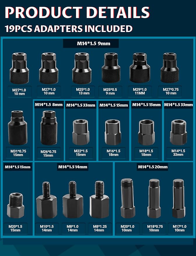 - 【Universal Adapters】 Includes 19 adapters (M14-M31 threads) for compatibility with most injectors: Adapters M20*1.0, M18*0.75, M17*1.0; adapters M8*1.25, M8*1.0, M8*1.5,M10*1.5 ; adapters M14*1.5, M16*1.5, M18*1.5, M20*1.5, M22*1.5; adapters M25*0.5, M25*1.0; adapters M26*0.75, M29*1.0, M31*0.75; adapters M27*0.75, M27*1.0,M27*1.0, No need to buy separate pullers—this kit handles diverse OE specs!