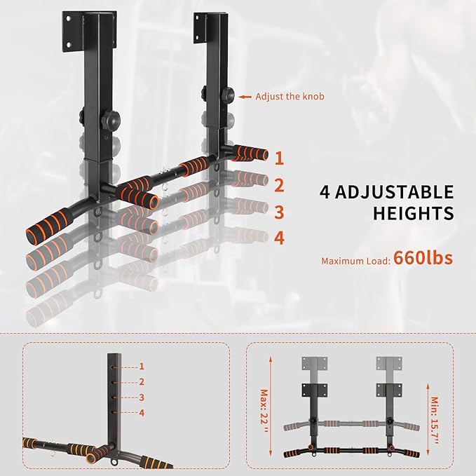 - Adjustable: This pull up bar wall mounted top rod offers 4 different height settings to meet various needs and is very suitable for users of all heights