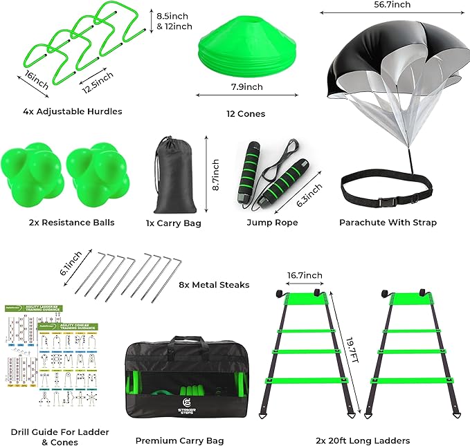 - "Agility Training Equipment Kit": Includes a 2 * 20ft agility ladders with 8 ground stakes, 4 adjustable agility hurdles, 12 vibrant yellow disc cones, and a high-resistance running parachute. Perfect for all skill levels—from beginners to pros—this set is built to elevate your speed, coordination, and overall athletic performance.