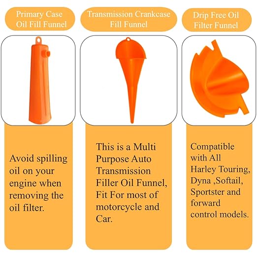 - Primary Case Oil Funnel: Prevent spills when changing your oil filter with this funnel, which fits snugly under the filter for easy access. Compatible with various Evolution 1340, Dyna, Softail (except FLSB), Touring, and Trike models.