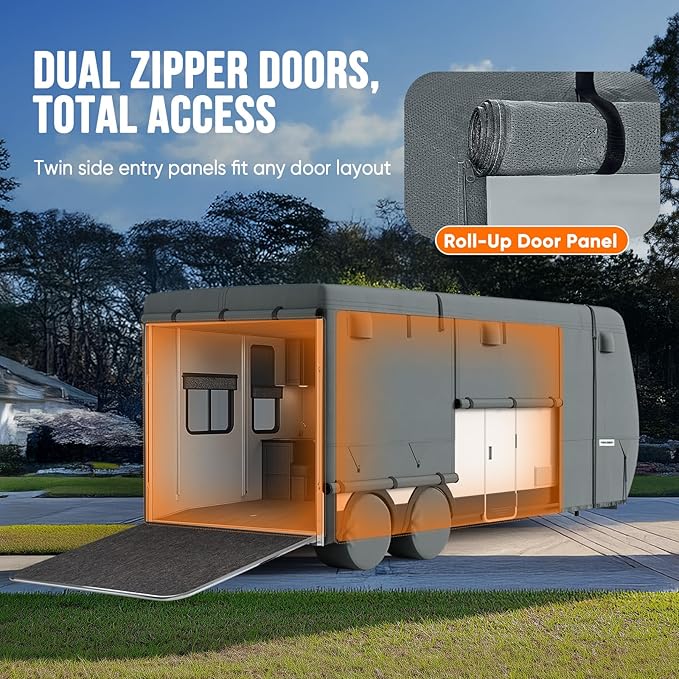 - 【Accessibility Design】2 Rollable zippered doors allow access to the RV doors and engine areas anytime, fits most rv, plus 2 rear zipper designed for toy hauler trailers. Easily load/unload large items like bikes and motorcycles.