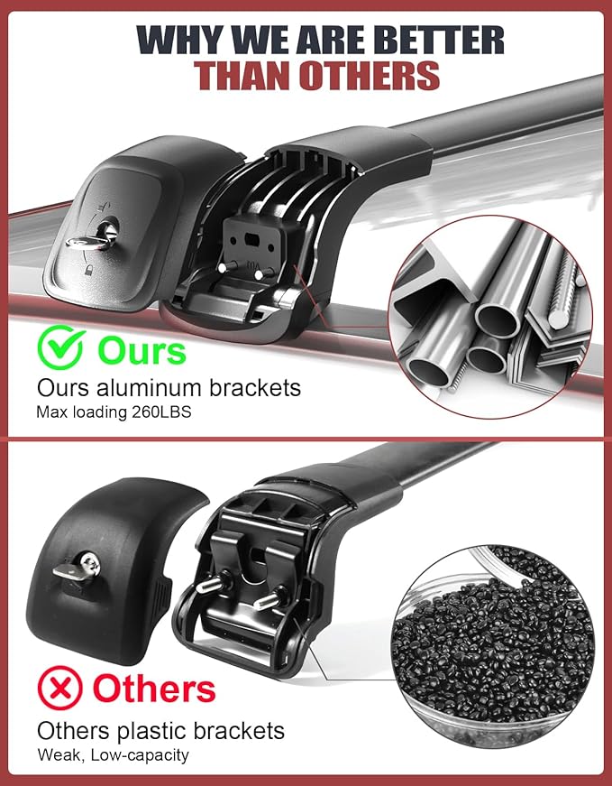- 【Exceed OEM parts in strongest】Die-casting aluminum brackets and upgraded heavy duty 2.4mm thickness aluminum bar which add to extra load capacity and durable, better than most in the market. Max load capacity is 260lbs (118kg), do not worry about the heavy luggage.