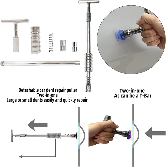 - 【Golden Puller & Dent Suction Cup】Aluminum alloy car dent puller kit with soft rubber base prevents paint damage. Combines suction cup dent puller technology with slide hammer functionality. Effectively removes dents from hail damage, doors, and fenders. Durable body repair dent removal tools for professional results.