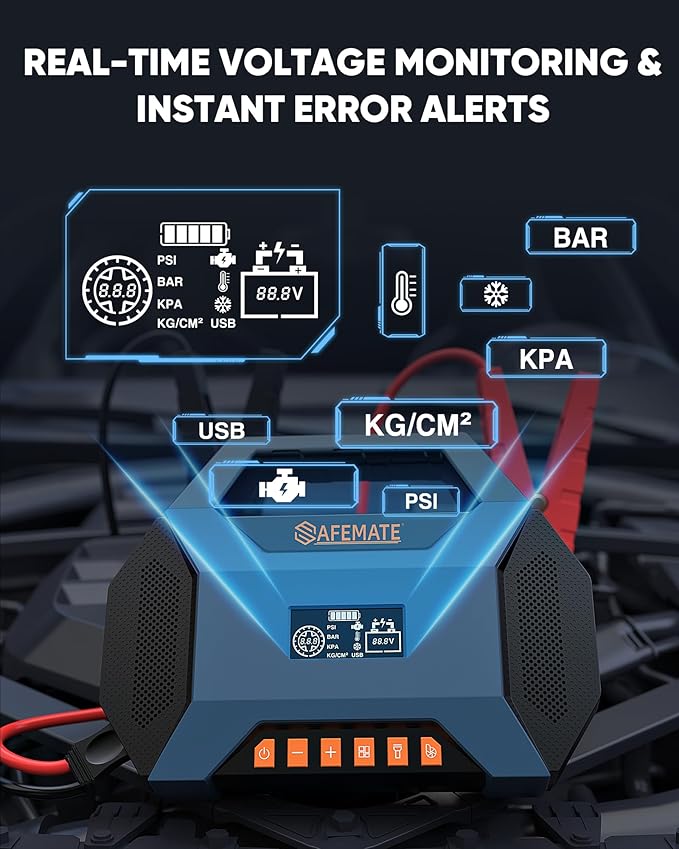 - 【Smart Voltage Screen & Error Alerts】 Instantly diagnose battery issues when your vehicle won't start. The built-in detector accurately displays whether battery voltage is normal or requires immediate jump-start assistance. The intelligent screen continuously monitors battery status and operational diagnostics, providing clear alerts for short circuits, reverse connection, temperature abnormalities, and low power - effectively preventing device damage and ensuring safe operation.