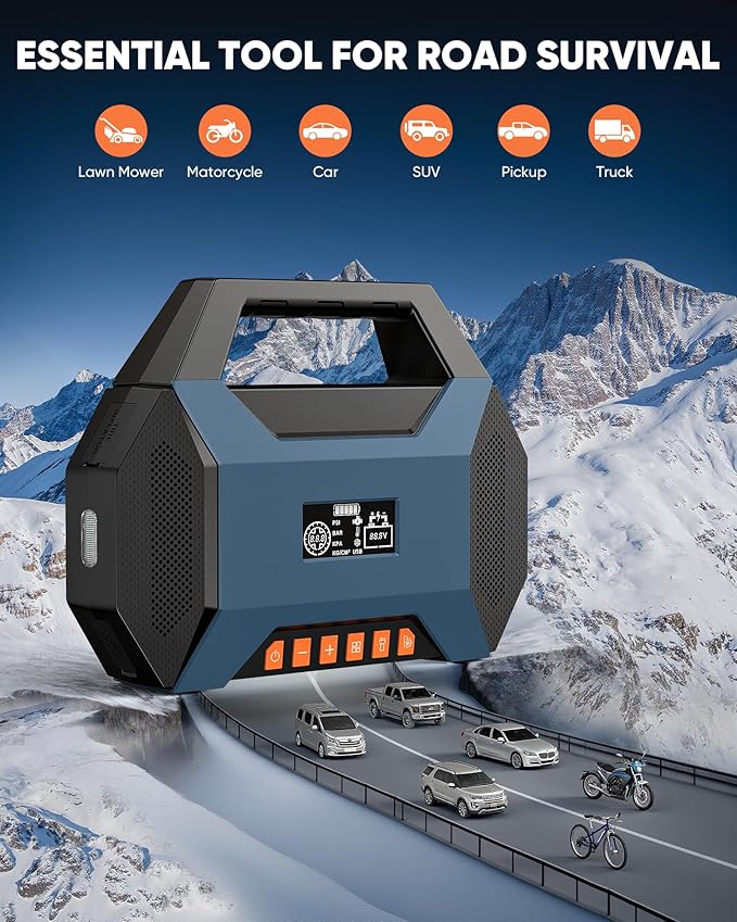- 【10-in-1 Safety Protection】 Features a built-in smart protection chip that comprehensively safeguards against 10 critical hazards including short-circuit, reverse connection, over-voltage, over-charge, over-discharge, and temperature abnormalities. UL certified for safe travel storage. With excellent fire and impact resistance, dustproof and waterproof and 1-meter drop protection. It reliably starts all 12V vehicles iincluding cars, SUVs, trucks, motorcycles, boats, ATVs, RVs, and more - ensuring absolute safety in any emergency.