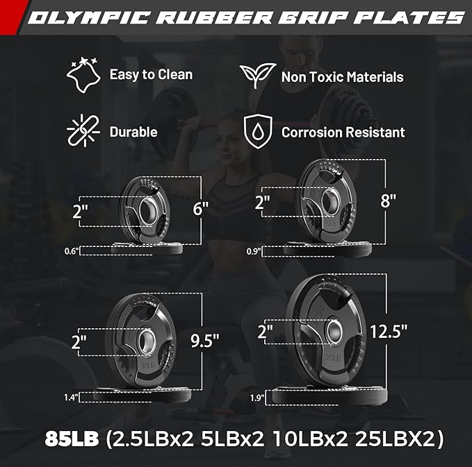 • 【85LB Barbell Set】The set includes a 4-foot barbell with a pair of collars and a set of 85lb weight plates: 2x2.5lb, 2x5lb, 2x10lb, 2x25lb. With the barbell included, the total weight adds up to 105lb. These cost-effective equipment are perfect for long-term training use.