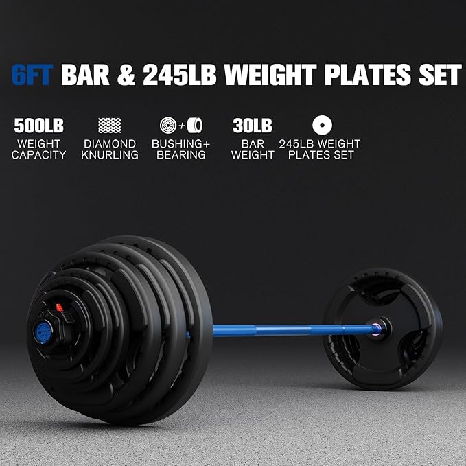 - 【245LB Barbell Set】The set includes a 6-foot barbell with a pair of collars and a set of 245lb weight plates: 2x2.5lb, 2x5lb, 2x10lb, 2x25lb, 2x35lb, 2x45lb. With the barbell included, the total weight adds up to 275lb. These cost-effective equipment are perfect for long-term training use.