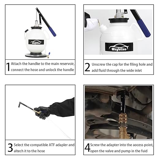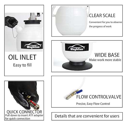 - 【Easy to operate】The quick connector can easily connect to the ATF adapter, the convenient valve can control the filling speed, the marked scale and transparent hose are convenient for you to observe the progress, and the wide base maintains the stability of the work
